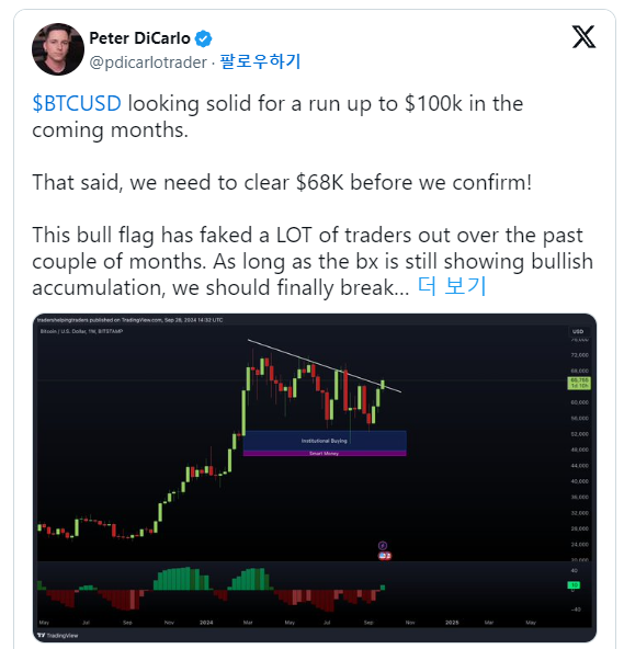 디카를로는 비트코인이 지난 3월부터 ‘강세 깃발(bull flag)’ 패턴을 형성하고 있으며, 이는 일반적으로 강세장이 계속될 때 나타나는 신호라고 설명했다. 그는 “이 패턴은 지난 몇 달간 많은 트레이더들을 혼란스럽게 만들었다”며 “6만8000달러를 돌파해야 비트코인의 추가 상승이 확정될 것”이라고 말했다.