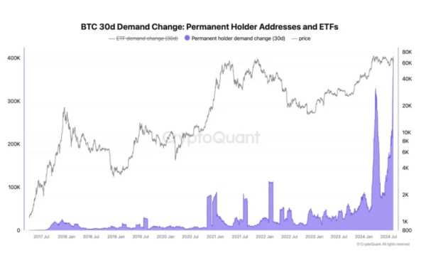 7일 크립토퀀트(CryptoQuant)의 주기영 대표는 X를 통해 “분명히 무언가가 일어나고 있다”며 “최근 비트코인 장기 보유자들의 30일간의 수요가 급증했다”고 전했다.