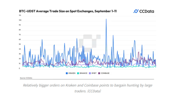 바이비트와 바이낸스의 단기 또는 데이 트레이더들은 소매 투자자일 가능성이 큰 반면 크라켄과 코인베이스에서의 저가 매수는 대형 투자자들에 의해 이뤄지는 것으로 보인다.