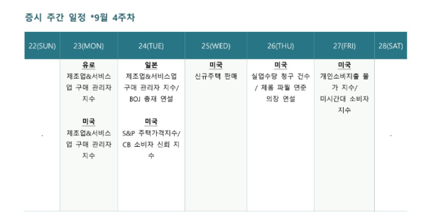 주 후반에는 미국의 주요 경제 지표 발표가 예정되어 있습니다. 제조업과 서비스 업황을 반영하는 (PMI), 2분기 성장률 확정치, 주간 실업보험 청구자 수 등이 공개될 예정입니다. 시장은 이러한 지표에 따라 경기 연착륙에 대한 기대감과 증시 변동성을 주시하고 있습니다.