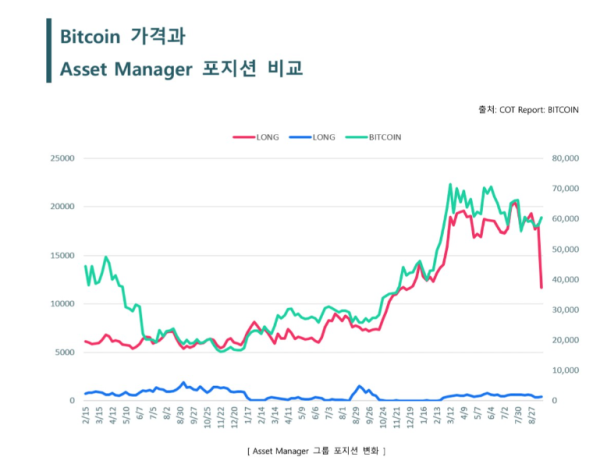 암호화폐 시장의 경우 이번주 변동성이 다소 확대될 가능성이 있어 보입니다. 기관의 경우 롱 포지션이 숏 포지션에 비해 우세하나 레버리지 펀드의 경우 숏 포지션이 많아 가격 변동에 민감하게 움직 수 있음에 주의해야 합니다. 과거 데이터를 비교한 결과 에셋 매니저 포지션 변동에 따른 비트코인 방향 예측이 높은 편이었습니다.