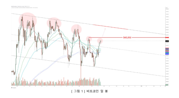 비트코인 가격 흐름과 관련 주요 저항선은 65K가 될 것으로 예측됩니다. 송승재 애널리스트는 “비트코인 가격이 강세를 유지하면서 주요 저항선까지 근접한 상황”이라며 “당장 앞두고 있는 주요 저항은 65K 부근”이라고 전했습니다.