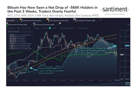 블록체인 분석 플랫폼 산티멘트는 8일 저녁(현지 시간) 엑스(X)를 통해 현재 비트코인 네트워크 상의 잔고가 있는 지갑은 5409만 개로 6월 15일 이후 56만6000 개 감소, 5주 최저 수준이라고 밝혔다.