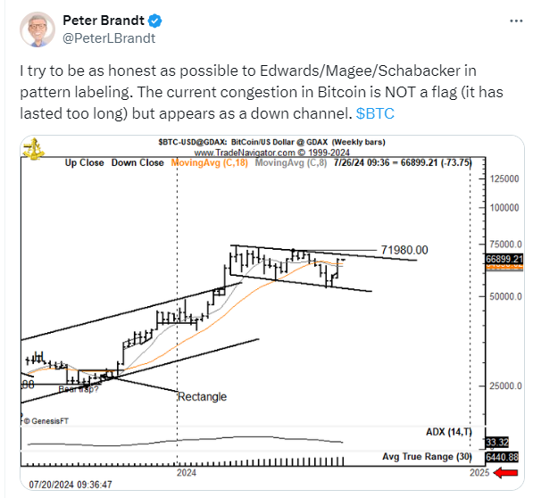 “비트코인 차트 패턴 상승 깃발 아닌 하락 채널”–피터 브랜트