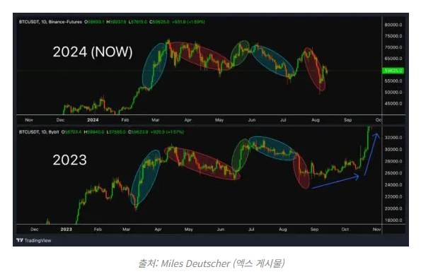 그는 14일(현지 시간) 엑스(X)에 올린 차트를 통해 2023년과 2024년 상황을 비교했다. 비트코인은 지난해 8월 급락세를 연출한 뒤 약 두 달간 대체적으로 횡보 움직임을 보였다. 그리고 10월에 가파르게 상승했다.