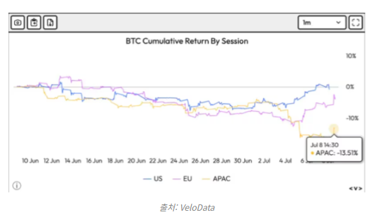 코인데스크는 8일(현지 시간) 지난 4주에 걸쳐 아시아, 유럽, 미국 거래 시간대 비트코인의 수익을 추적한 벨로 데이터(VeloData) 차트를 소개했다.
