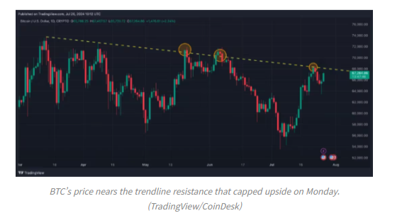 코인데스크에 따르면 비트코인은 전일 6만3500 달러 부근에 위치한 50일 단순이동평균을 시험한 뒤 반등, 3월 고점과 4월 고점을 연결하는 하방향으로 기울어진 추세선에 접근했다. 비트코인은 금주 초(22일), 그리고 지난 5월 이 추세선에서 저항을 받고 후퇴한 사례가 있어 이 추세선 돌파 여부가 주목되는 상황이다. 트레이딩뷰 차트는 현재 추세 저항선이 6만8000 달러 조금 위에 자리잡고 있음을 보여준다.