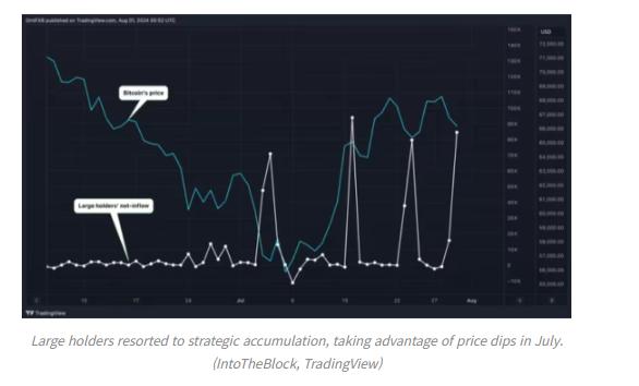 블록체인 분석 회사인 인투더블록(IntoTheBlock)과 트레이딩뷰에 따르면, 비트코인 유통량의 최소 0.1%를 보유한 주소(대형 보유자)들은 7월에 8만4000 BTC 이상, 약 54억 달러 상당의 비트코인을 추가로 매입했다. 이는 비트코인 수량 기준 2014년 10월 이후 가장 큰 월간 매입량이다.