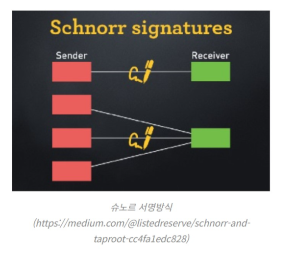 슈노르(Schnorr) 서명 (BIP 340): 새로운 서명 방식인 슈노르 서명은 다중 서명을 하나의 서명으로 집계할 수 있어, 트랜잭션의 프라이버시와 효율성을 높인다. 이를 통해 다중 서명이 포함된 트랜잭션이 일반 트랜잭션과 구분되지 않으며, 트랜잭션 크기를 줄여 수수료도 낮아진다.