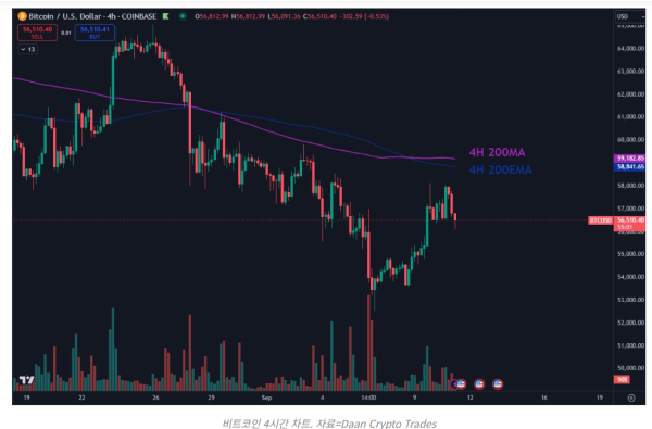 인기 트레이더(Daan Crypto Trades)는 4시간 차트에서 특정 패턴을 발견했다. 그는 비트코인이 200기간 단순 이동 평균(SMA)과 지수 이동 평균(EMA)을 넘지 못하고 있다고 분석했다. 이 두 이동 평균선은 각각 5만9200 달러와 5만8840 달러에서 저항선을 형성하고 있다.