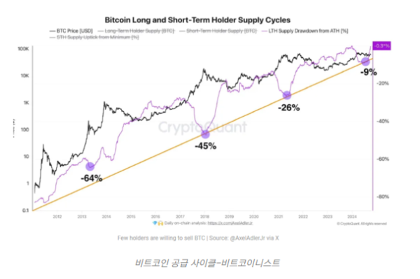 비트코이니스트에 따르면 2024년 10월 기준, 온체인 데이터를 분석한 결과, 비트코인 보유자의 10% 미만만이 비트코인을 판매할 의향이 있는 것으로 나타났다. 이는 2021년 중반의 26%, 2013년의 64%에 비해 크게 낮은 수치다.