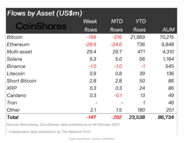 이더리움 기반 투자상품 역시 순유입을 기록한 지 한 주 만에 다시 순유출로 돌아섰다. 이더리움은 지난주에 2890만 달러의 순유출을 기록했다. 코인셰어스의 제임스 버터필(Butterfill) 연구 책임자는 “이더리움에 대한 투자자들의 관심이 아직 충분히 회복되지 않았다”고 설명하며, 투자자들의 신뢰 부족이 유출의 원인임을 시사했다.