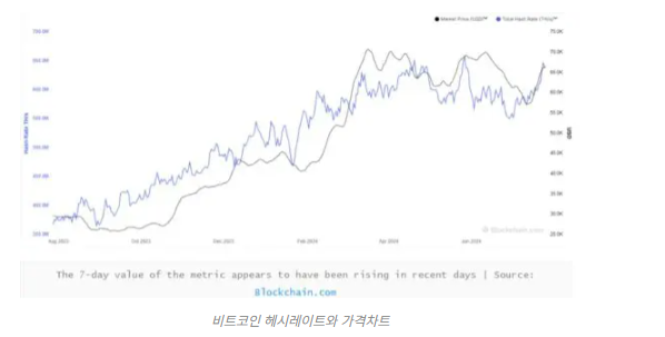 비트코인 가격이 6만 7000 달러를 넘어 회복되면서 채굴 해시레이트가 사상 최고치에 근접했다는 온체인 데이터가 나왔다.