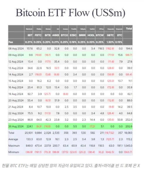 파사이드 인베스터스 데이터에 따르면 최근 비트코인 현물 ETF 순 유입액이 대폭 늘었다. MN 컨설턴시의 최고 정보 책임자(CIO)이자 가상자산(암호화폐)전문가인 마이크로 반 데 포프는 지난 19일 이 펀드가 무려 2억200만 달러의 순 유입을 기록했다고 밝혔다. 이는 지난주 월요일 6210만 달러 유입과 비교해 큰 증가를 보여주며, 투자자들의 일일 수요가 급증하고 있음을 나타낸다.