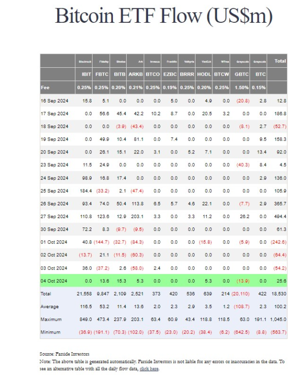 10월 4일(현지시간) 미국 비트코인(BTC) 현물 ETF에 약 2560만 달러 자금이 순유입됐다. 3거래일 만에 순유입으로 전환됐다.
