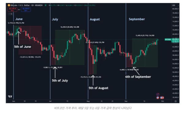다안 크립토 트레이드는 비트코인이 6월부터 매월 다섯째 날에 “바닥을 찍고 고점을 형성해왔다”고 지적했다. 그의 게시물에 따르면, 매월 다섯째 날 비트코인 가격이 대규모 조정을 기록했으며, 9월의 경우 여섯 번째 날에 발생했다.