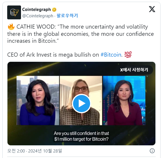코인텔레그래프는 27일(현지시간) 해당 부문을 편집해 엑스에 공유했다.
