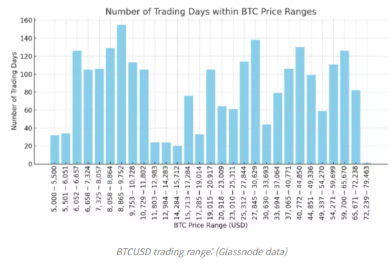 이 분석에 따르면, 비트코인의 가장 긴 범위 내 거래는 8865 달러에서 9752 달러 사이에서 155일 동안 유지되었다. 이는 2018 ~ 2019년 시장 주기와 일치한다. 당시 비트코인은 2017년 강세장 이후 그리고 2019년 중반 시작된 회복 이전 다지기 과정을 겪었다. 비트코인이 5000 달러 이하에서 거래되던 2018년 11월부터 2019년 5월의 약세장 바닥은 이 기간에서 제외한다.