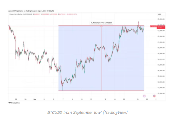 비트코인이 전통적으로 약세를 보였던 9월에 약 5만2500 달러의 저점 대비 22% 상승하는 탄력성을 보여주면서 향후 움직임에 관심이 쏠리고 있다.