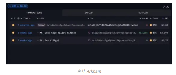 비트코인 $20억 보유 지갑 테스트 전송 실시 … 비트고의 마운트곡스 채권 배분 준비 추정
