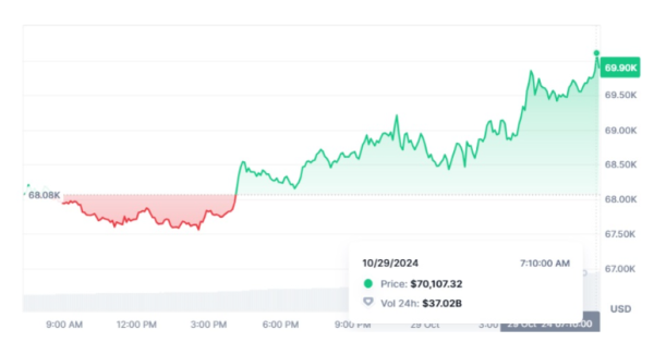 비트코인이 7만 달러 선을 터치했다. 지난 3월 기록한 사상 최고치 7만3000 달러 대에 5% 차이로 근접한 상황이다. 미국 대통령 선거를 앞두고 암호화폐 시장에 투자 열기가 고조되는 모습이다.