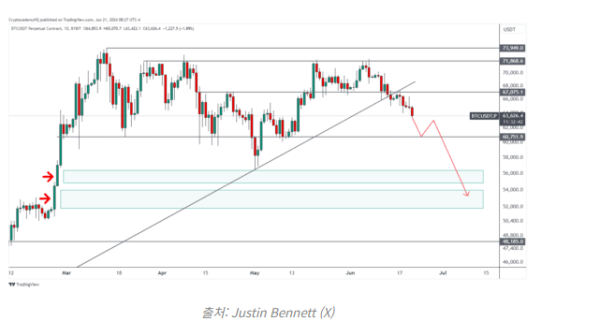 외환, 주식, 암호화폐 거래에서 23년 넘는 경력을 보유한 저스틴 베넷은 이날 엑스(X)를 통해 “비트코인이 여전히 범위 내에서 움직이고 있지만, 2023년 10월 추세선의 붕괴, 그리고 2월 26일과 27일의 불균형이 맞물려 5만2000 달러 5만4000 달러로 하락할 가능성이 높다”고 내다봤다.