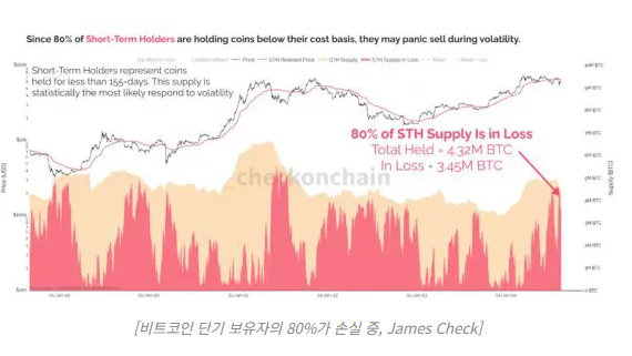 한편, 8월 19일 온체인 분석가 제임스 첵(James Check)은 엑스(X, 구 트위터)를 통해 “단기 보유자 중 80% 이상이 현재 보유한 비트코인이 매수 가격보다 낮아 손실을 보고 있다”고 지적했다.