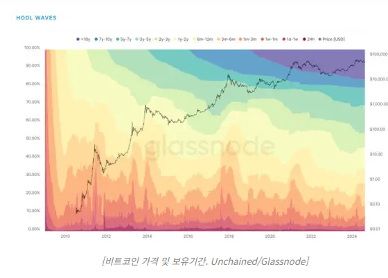 이 차트는 블록체인 데이터를 활용해 비트코인이 마지막으로 이동한 시점을 기준으로 지갑에 보관된 시간을 분석한다.