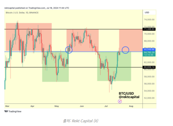 [뉴욕 = 장도선 특파원] 비트코인이 6만5000 달러를 지지선으로 회복하지 못할 경우 추가 하락할 위험이 있다고 암호화폐 분석가 렉트 캐피탈(Rekt Capital)이 전망했다.