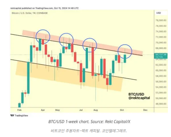 렉트 캐피털은 “비트코인이 이번 주 저항선을 돌파한 채 마감할 수 있다면 더 강력한 상승을 기대할 수 있다”고 설명했다. 그는 이번 주 주간 마감 가격이 6만 8000달러 이상에서 형성될 경우, 그간 저항했던 하락 채널을 벗어나는 중요한 신호가 될 것이라고 덧붙였다.