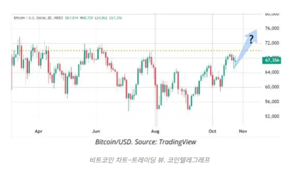 비트코인(BTC) 가격은 한때 6만 8700달러까지 상승했지만, 7만 달러를 넘어서지 못했다. 비트코인의 향후 가격 상승은 경제 상황, 시장의 수급 변화, 그리고 규제 환경에 크게 의존하고 있다.