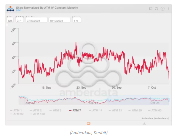 코인데스크는 10일(현지 시간) 앰버데이터 자료를 인용, 데리빗 거래소에서 비트코인의 7일 옵션 스큐가 -8.5%로 하락, 4주 최저를 기록했다고 보도했다. 옵션 스큐는 콜 옵션과 풋 옵션의 가격 차이를 나타낸다.