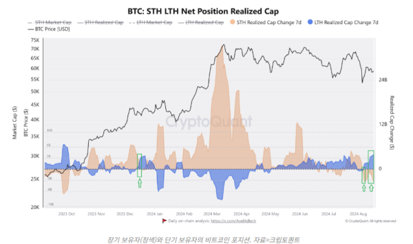 장기 보유자의 실현 시가총액은 30억 달러로, 2023년 12월 이후 가장 많다. 장기 보유자들이 여전히 비트코인을 축적하고 있음을 나타낸다. 단기 보유자들의 매도세도 약화되고 있음을 시사한다.