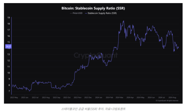 이와 유사하게 스테이블코인 공급 비율(SSR)은 스테이블코인을 사용해 비트코인을 매수할 수 있는 유동성의 양을 나타낸다. SSR은 전체 암호화폐 시가총액을 모든 스테이블코인의 합산 시가총액으로 나눈 비율이다.