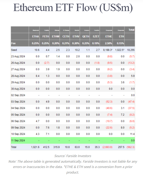 이더리움 ETF에는 1140만 달러가 유입됐다. 8월 28일 590만 달러 순유입 이후 첫번째 플러스 흐름이다. 블랙록 430만 달러, 피델리티 710만 달러 순유입을 기록했다. 자금 유출이 발생한 펀드는 없다.