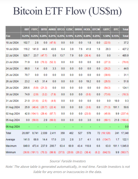 6일(현지 시간) 파사이드 인베스터스에 따르면 전일(월) 11개 비트코인 ETF 전체적으로 1억6840만 달러 순유출을 기록했다. 그레이스케일 비트코인 트러스트 6910만 달러, 피델리티 ETF 5800만 달러, 아크 21셰어스 ETF 6900만 달러 마이너스 흐름을 기록했다.