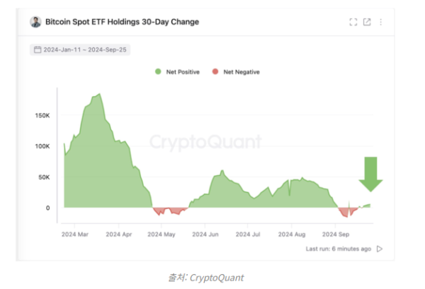 크립토퀀트 차트에 따르면 30일 총 보유고의 순변화 지표는 9월 대부분 기간 마이너스 영역에 머물다 25일 플러스로 전환됐다. 이는 비트코인 ETF를 통한 축적 추세 회복을 시사한다.