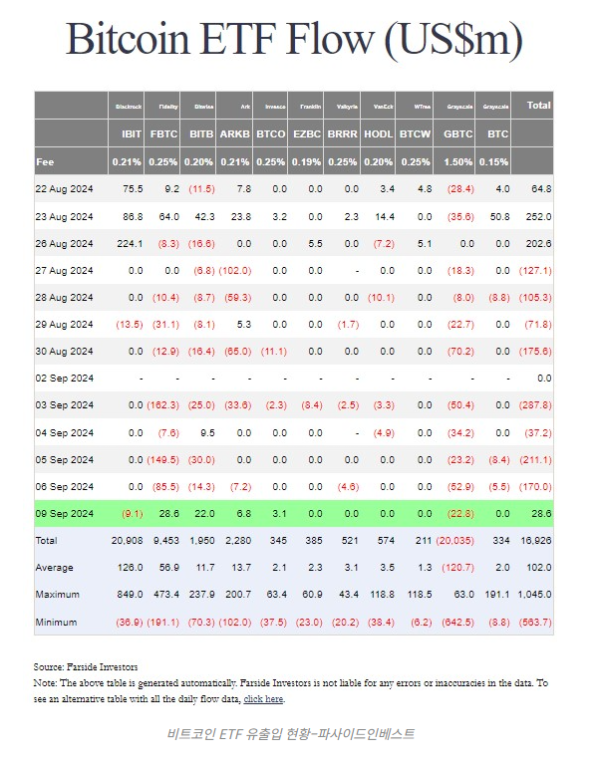 9일(현지시간) 파사이드 인베스트에 따르면 이날 미국 비트코인(BTC) 현물 ETF에 2,860만 달러가 순유입됐다. 이더리움 ETF에서는 520만 달러가 순유출 됐다.