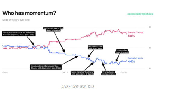 해리스 부통령은 8월과 9월 대부분의 기간 동안 폴리마켓에서 트럼프를 앞섰다. 그러나 10월 상반기에 트럼프의 승리 확률이 급격히 증가하며 상황이 역전됐다.