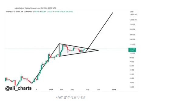 마르티네즈의 분석에 따르면, 차트에서 솔라나 가격은 157.98달러로 채널 상단 추세선 바로 아래에 위치해 있다. 또한 가격은 130 달러 근처의 주요 지지선과 현재 가격인 160 달러선 근처 저항선 사이 좁은 범위 내에서 다져지고 있다. 이 패턴이 유지될 경우, 추세선이 만나는 지점에서 브레이크아웃이 발생할 수 있다.