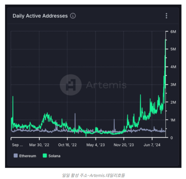 아르테미스의 데이터에 따르면, 솔라나(Solana)의 활 주소 수는 2023년 말부터 급증해 이더리움(ETH)을 추월했다. 그러나 이더리움은 여전히 스테이블코인 시가 총액, 스테이블코인 전송량, 총 가치 잠김(TVL) 등에서 솔라나를 앞서고 있다.