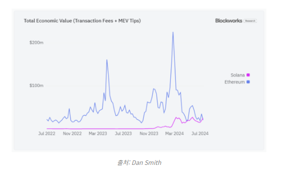 블록웍스 분석가 댄 스미스의 엑스(구 트위터) 게시물에 따르면 솔라나의 ‘전체 경제 가치(Total Economic Value)’는 주간 기준 2500만 달러로 이더리움의 2100만 달러를 넘어섰다. 스미스는 전체 트랜잭션 수수료와 MEV(최대 추출 가능 가치) 팁을 더해서 전체 경제 가치를 계산했다.