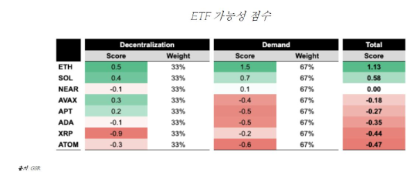 보고서는 현물 ETF 승인을 획득하는 중요한 두 가지 요인으로 분산화 수준과 시장 수요를 주목했다. 특히, GSR은 독자적인 지표를 이용해 주요 가상화폐를 분석하고 ‘ETF 가능성 점수’를 산출했다.