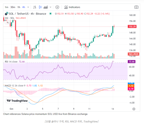 기술 지표 상으로는 시간별 MACD는 솔라나/USD 페어의 상승 구간에서 페이스를 얻고 있다. 시간별 상대 강도 지수(RSI)는 50 수준 이상이다. 주요 지지선은 147.50달러와 144.40달러이며, 주요 저항선은 155달러와 162달러이다.