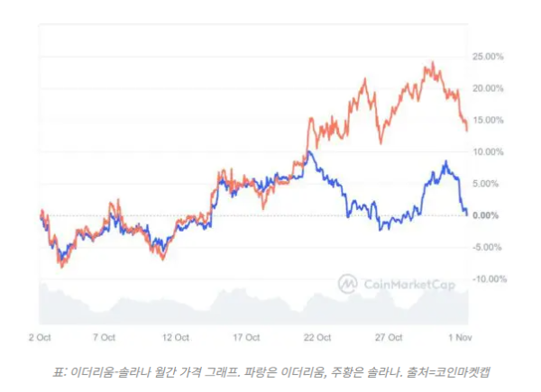일일 거래량도 솔라나가 앞서 나갔다. 같은 날 솔라나의 일일 거래량은 41억2000만달러(약 5조6800억원)로, 이더리움의 14억8000만달러(약 2조400억원)보다 약 3배 많았다. 일일 트랜잭션(거래) 역시 솔라나가 1419만건을 처리해 이더리움의 트랜잭션 27만건을 크게 웃돌았다.