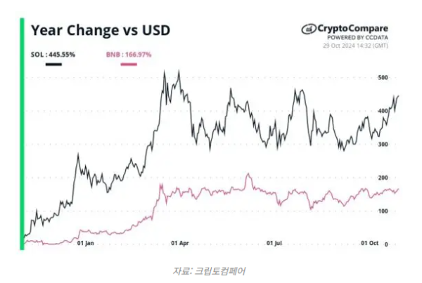 올해 솔라나는 괄목할 성과를 보였다. 크립토컴페어(CryptoCompare) 데이터에 따르면 SOL은 지난 12개월 동안 445% 이상 상승한 반면, BNB는 약 167%의 상승폭을 기록했다.