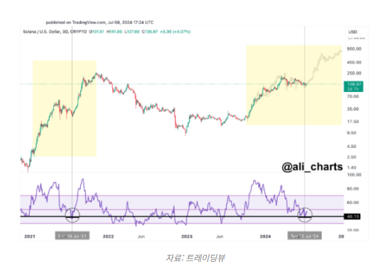 차트를 보면 솔라나의 RSI가 현재 약 40에 위치해 있어 자산이 다소 저평가되고 있음을 시사한다. 흥미롭게도, 2021년에도 이와 같은 RSI 수준이 큰 강세 브레이크아웃으로 이어졌다.