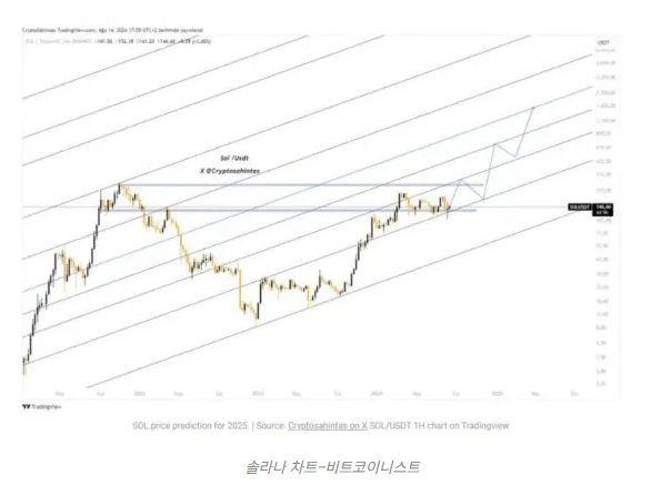 유명 비트코인 매크로 애널리스트인 크립토사힌타스(Cryptosahintas)는 X에서 솔라나의 가격 궤적을 예측하는 차트를 공유하면서, 2025년 중반까지 시가총액이 4,600억 달러를 초과할 것이라고 전망했다.