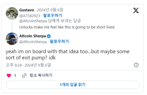 수이 차트에 대해 “코인 물량 배포(언락) 때문에 단기 상승에 그칠 것 같은 느낌이 든다” 는 한 구독자의 댓글에 셰르파가 답을 다는 과정에서 이같은 언급이 나왔다.