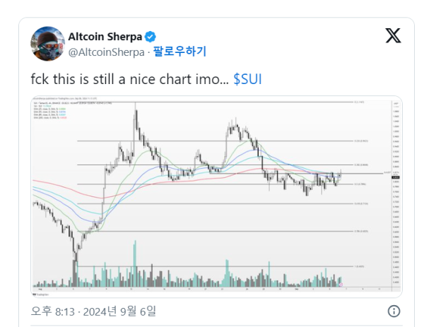6일(현지 시간) 알트코인 셰르파는 22만2500 명에 달하는 엑스 구독자들에게 수이(SUI)의 차트를 공유하며 “차트 모양이 아직도 좋다” 면서도 “탈출을 위한 일종의 펌프(가격 띄우기)인가? 잘 모르겠다”고 말했다.